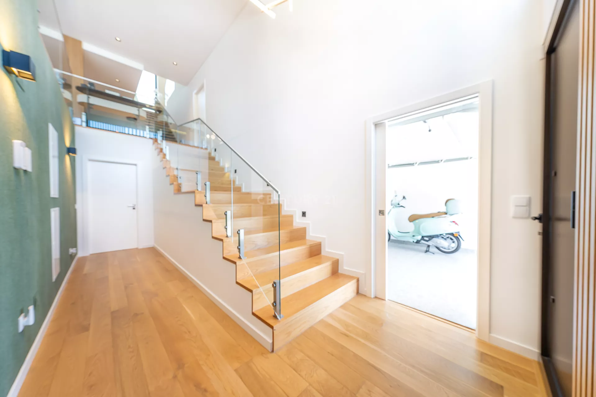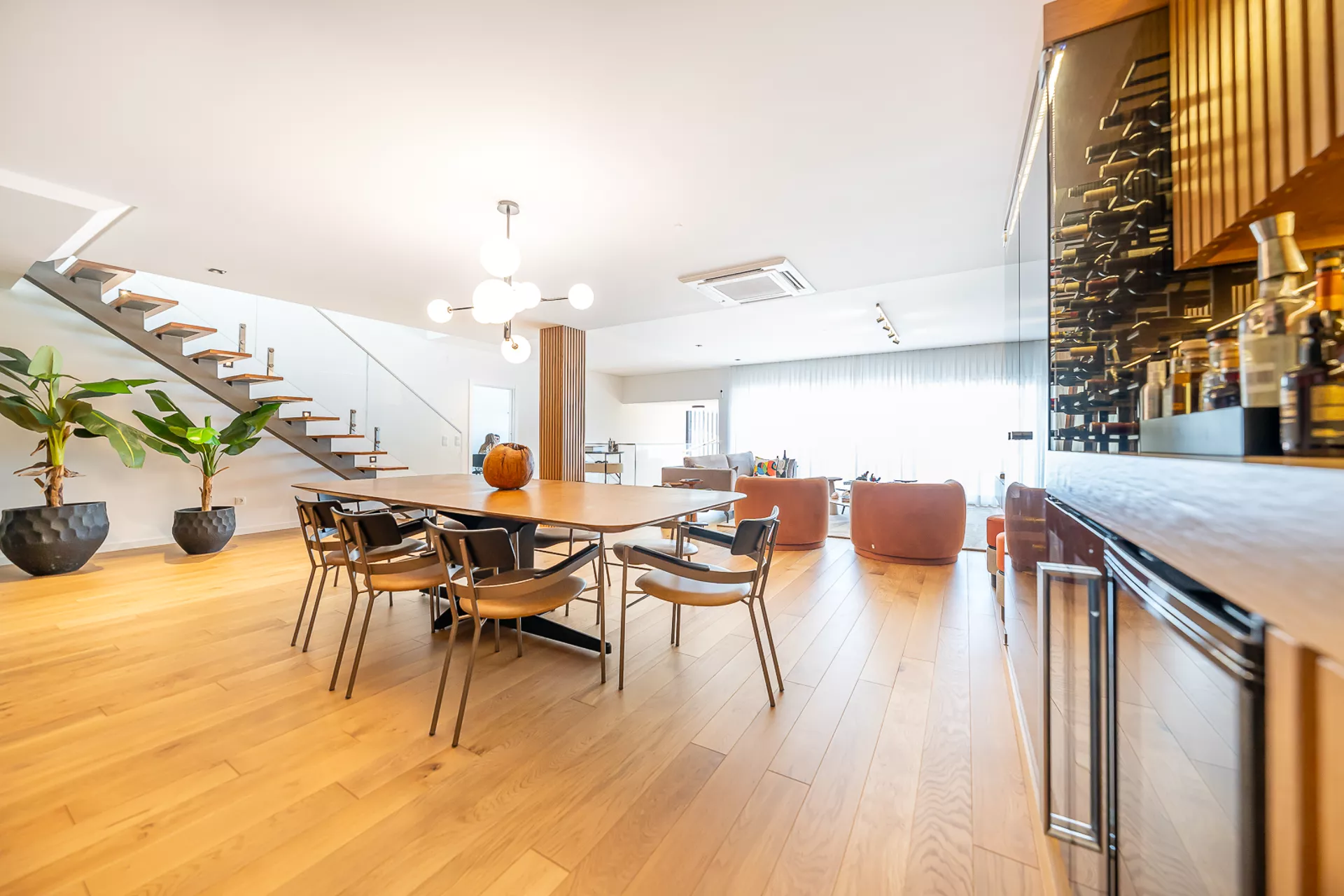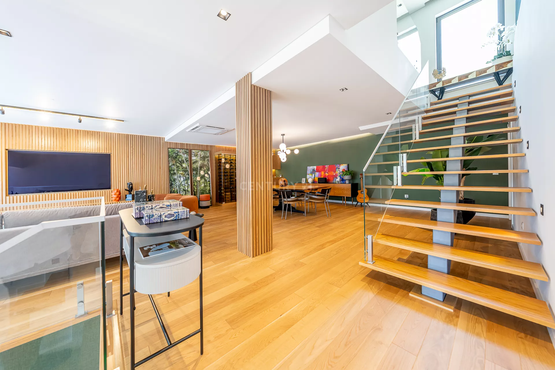 The property features double-height ceilings. The impressive double-height ceilings increase the feeling of space and natural light, creating an airy and sophisticated environment.