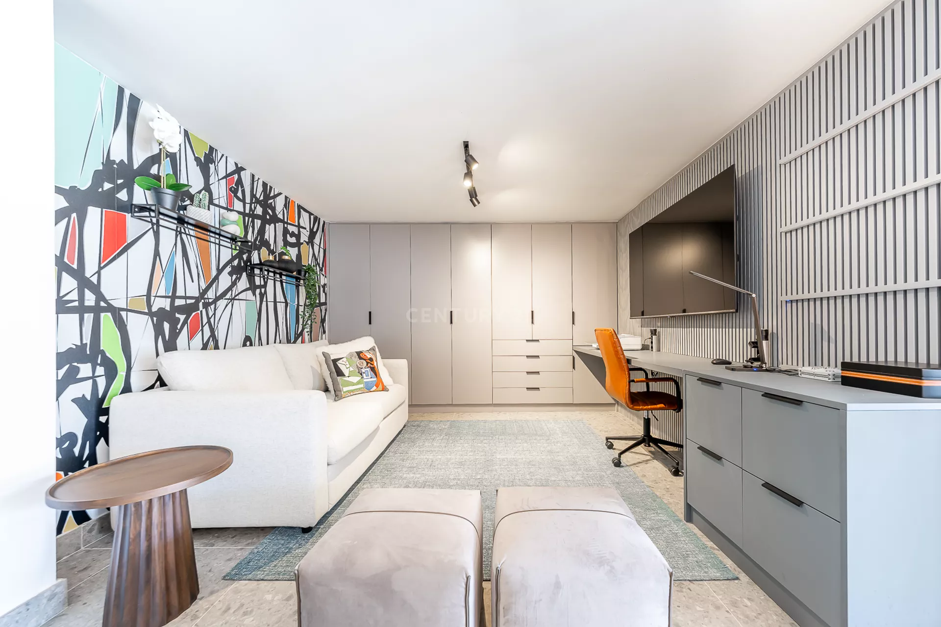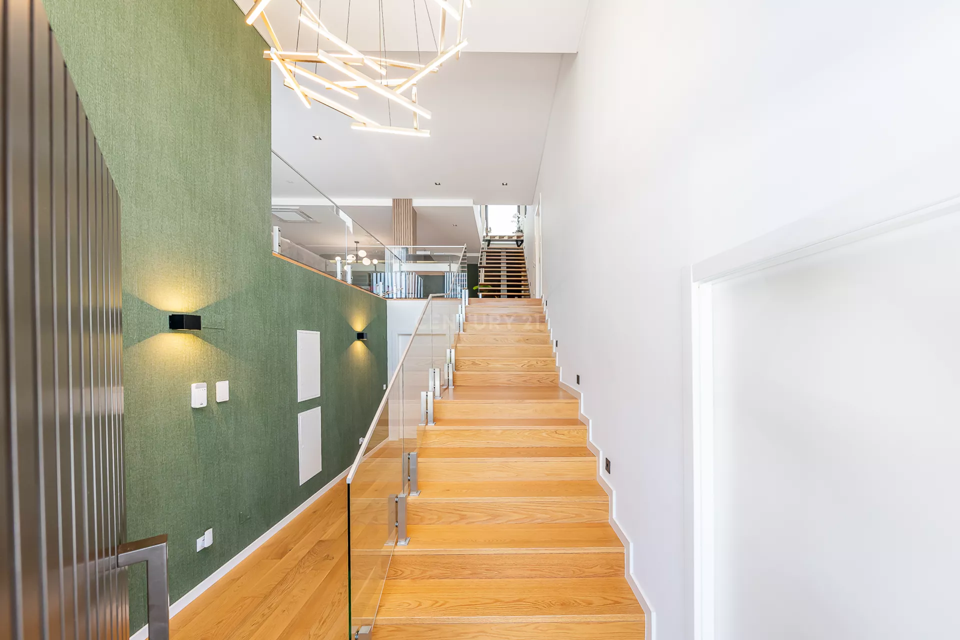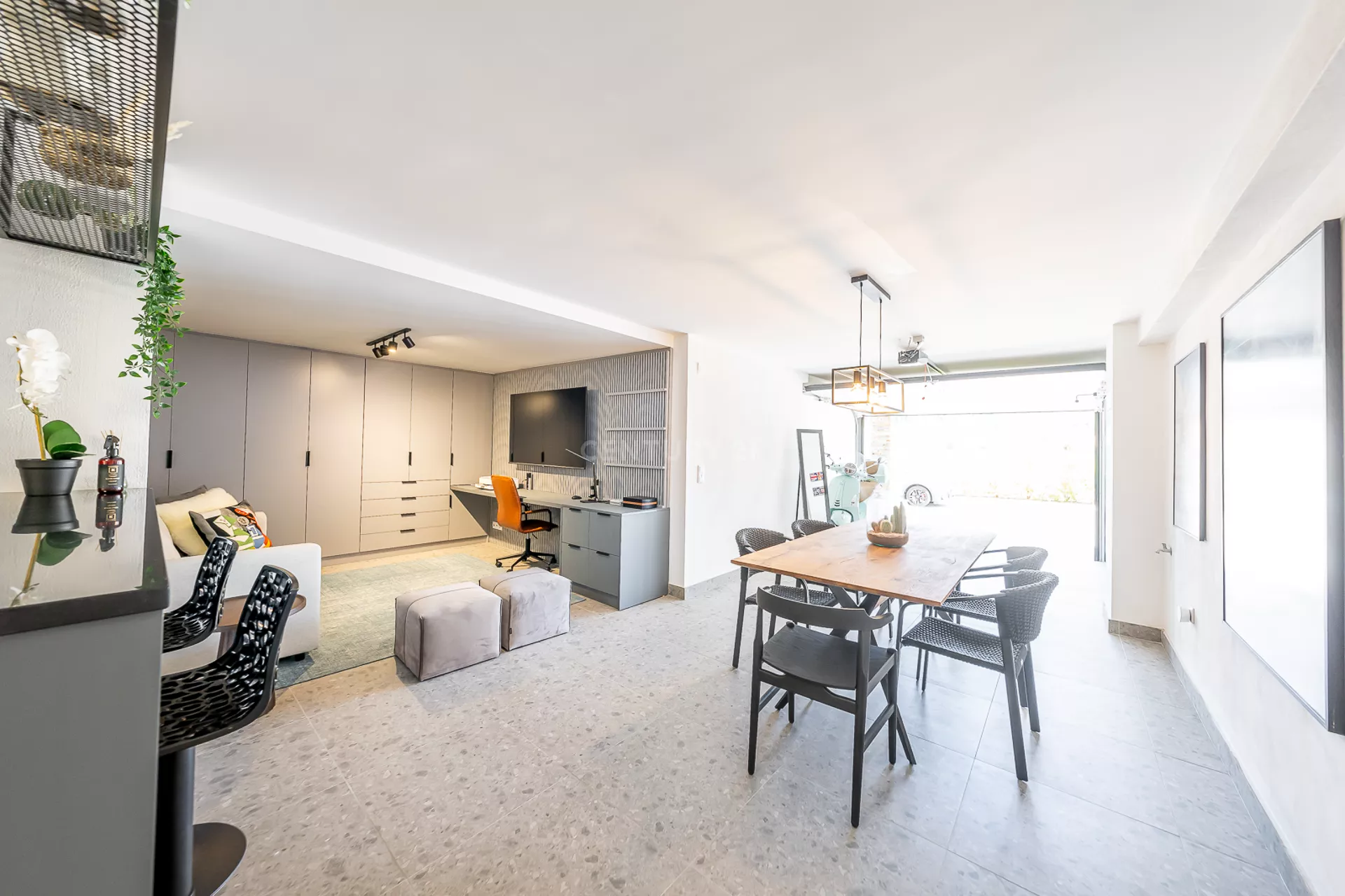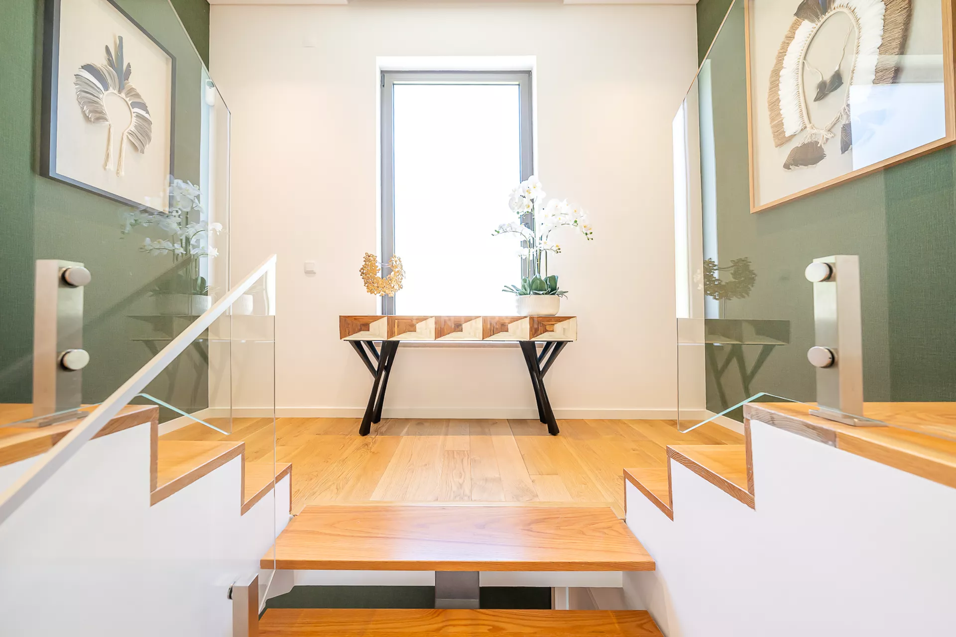 The property features double-height ceilings. The impressive double-height ceilings increase the feeling of space and natural light, creating an airy and sophisticated environment.